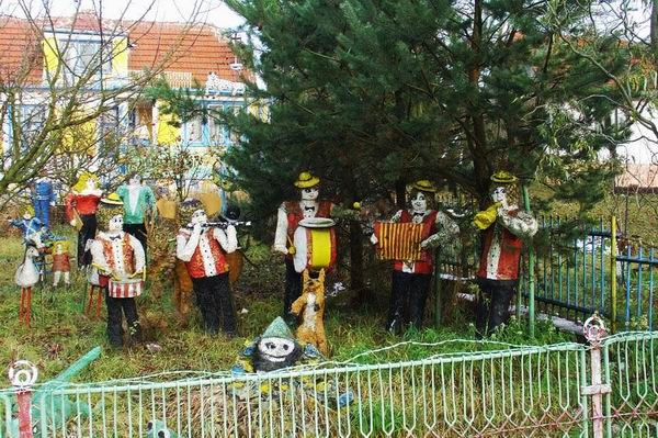 Made from concrete some forty sculptures populate the garden, where one can see musicians, gnomes, princes and princesses, all kinds of common people and all kinds of animals. such as giraffes, zebras, lions, frogs, elephants, all items being colorfully painted and provided with hats and/or attributes suited to the depicted personality..